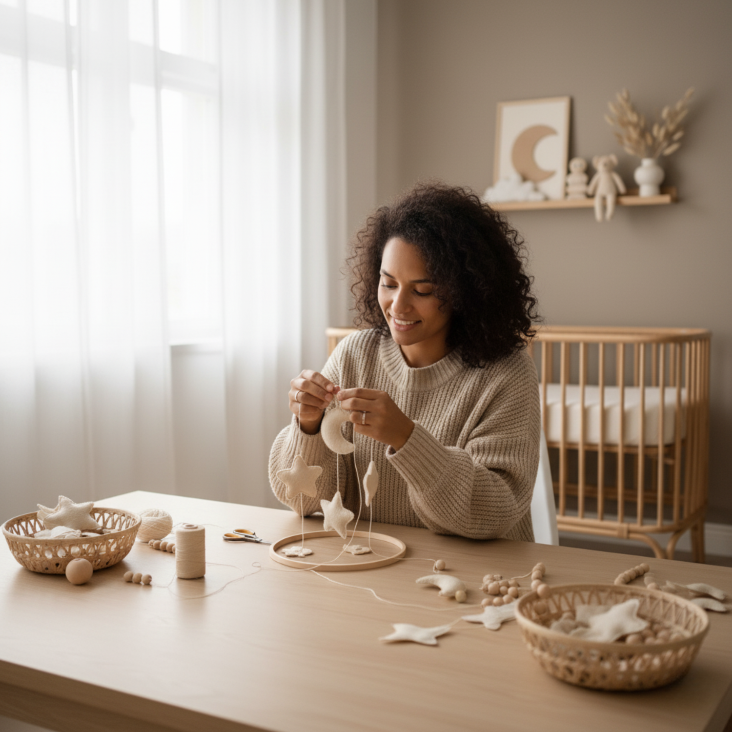 Coton doux, bois naturel et teintes apaisantes - sains pour l'environnement de bébé.
